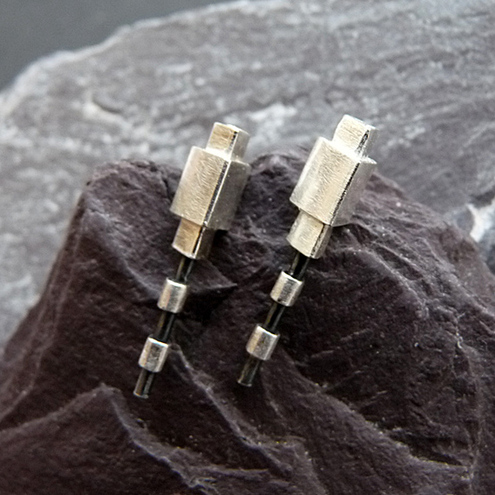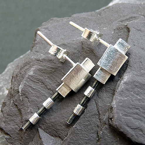 These contemporary studs are made of sterling silver. They have been partially oxidized and polished to a bright and shiny finish. They have sterling butterfly scrolls.