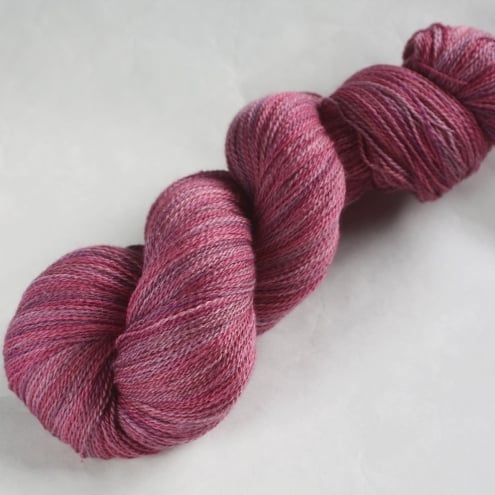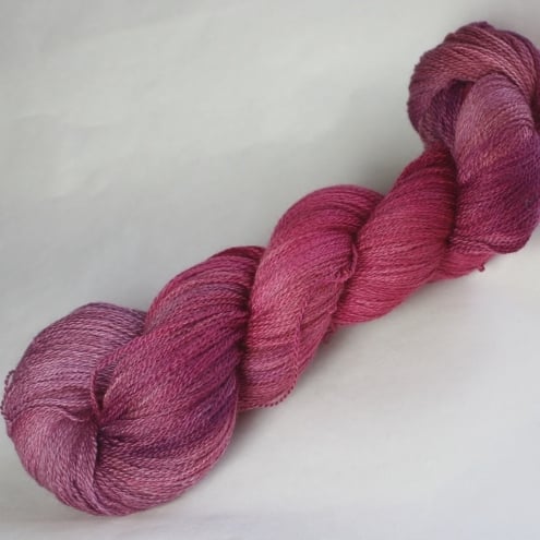 This is beautiful, silky, soft laceweight yarn in shades of rose pink and mauve. It is reskeined as shown in the first two photographs but is shown before reskeining in the third photograph for reference only.