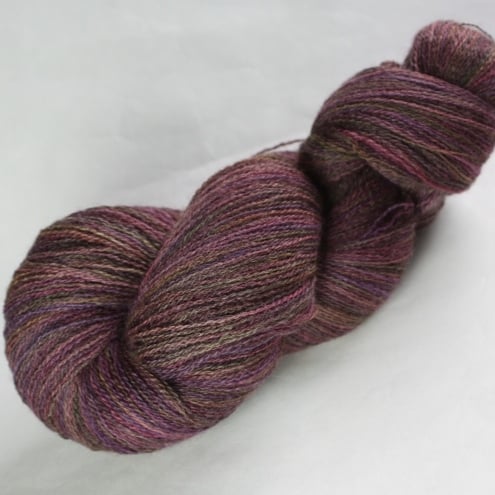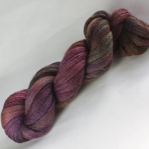 Woodsy browns and plummy purples with a little pink and olive green. This yarn is lustrous, lofty and slightly fuzzy. It should make beautiful lace projects. It is reskeined as shown in the first two photographs but is shown before reskeining in the third photograph for reference only.