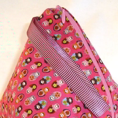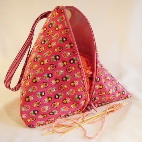 Sewn in beautiful designer fabric, these gorgeous Pyramid Project Bags measure 7 high x 7 wide. The cases are fully lined with a zip fastening closing and carry handle made from ribbon. They are able to hold a sock knitting project with Dpns and 100g of yarn or a 100g of yarn, crochet project, yarn and hook.