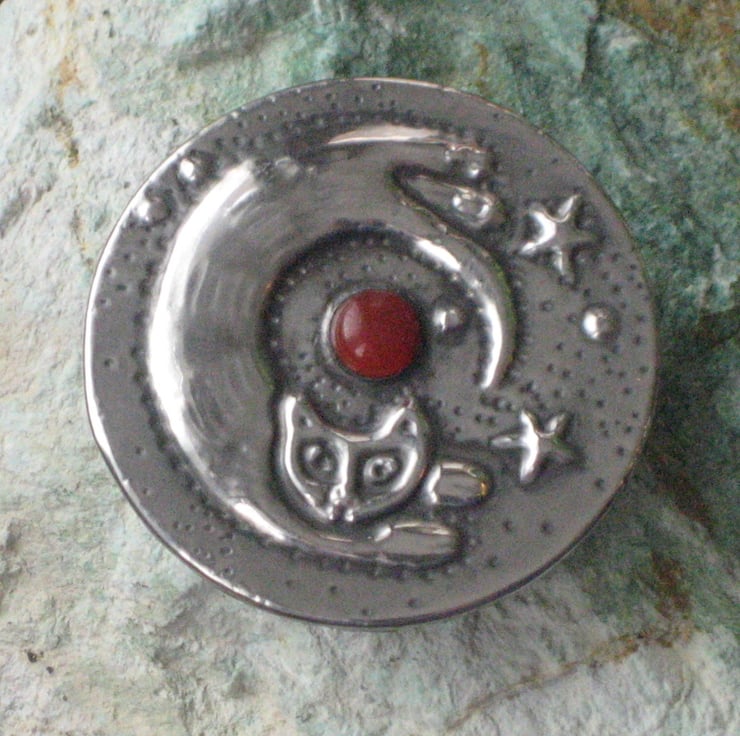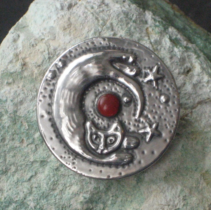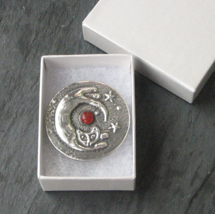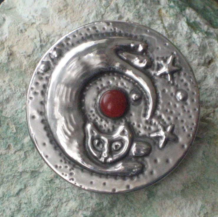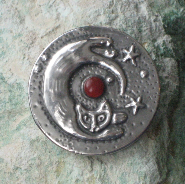 This brooch has been hand-made in shiny modern pewter, and features a glowing orange carnelian stone. It measures 40mm,1.5 ins across and has a 25mm,1 pin with safety catch on the reverse. Comes gift boxed.