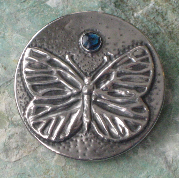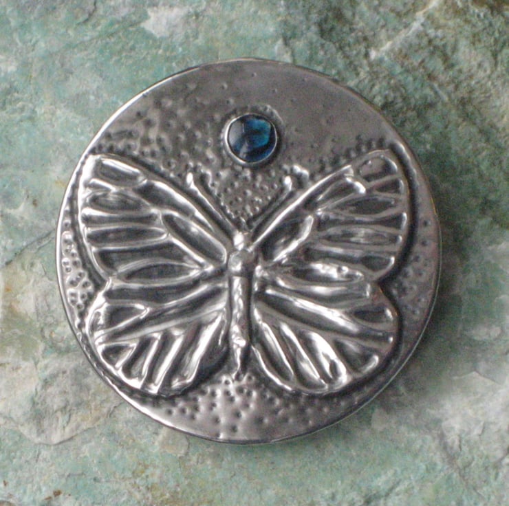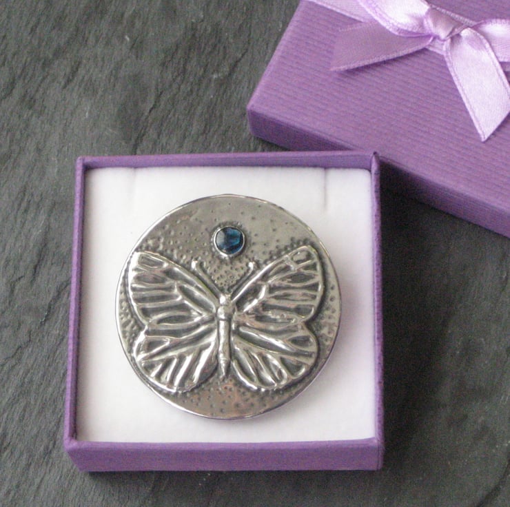 Was £15.99, now £10. This large dramatic brooch features a colourful paua shell cabochon. It has been entirely hand-made in shiny modern pewter. In spite of its size of 45mm, it is light in weight and has a 25mm pin with safety catch on the reverse.Comes in a pretty purple gift box.