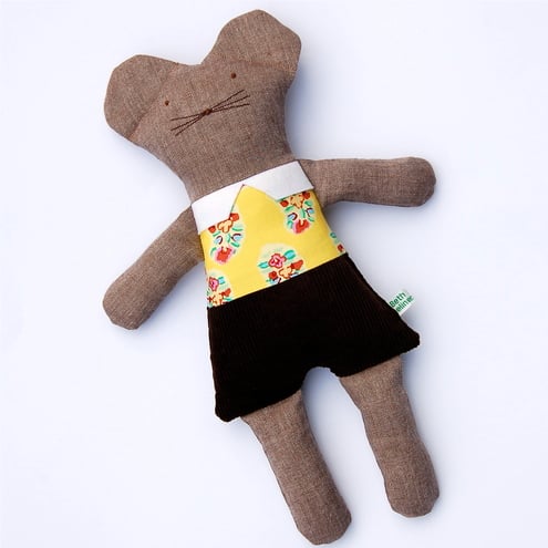 Cotton body in Yellow Asha Print with white wool felt collar and Brown Cord Shorts.