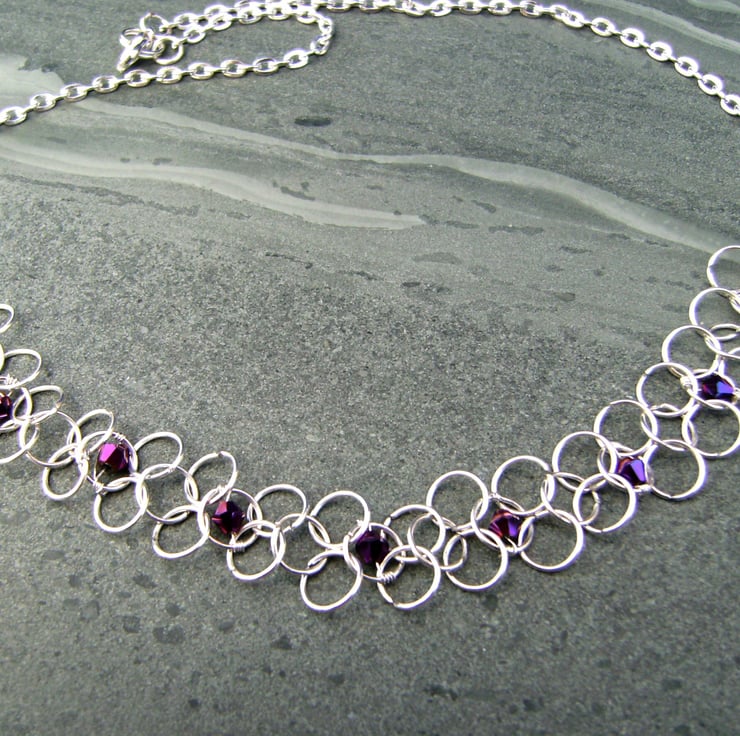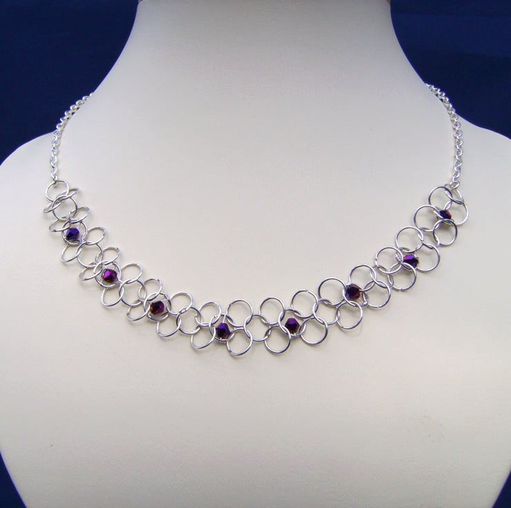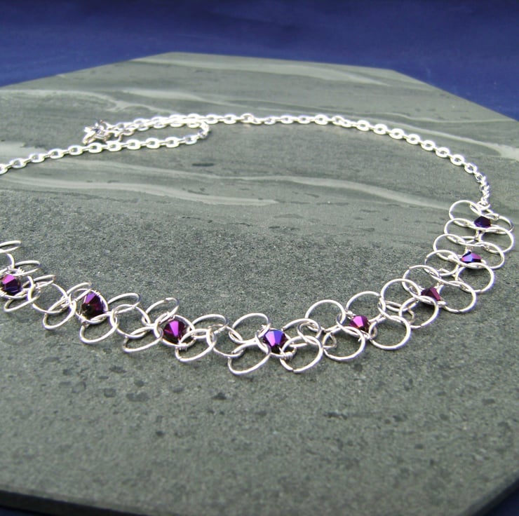 This chainmail necklace has been created using silver plated chain & jump rings with purple crystal beads. It is approximately 18 inches & will be sent in a gift box. Its size can easily be customised so please ask if you would like this.