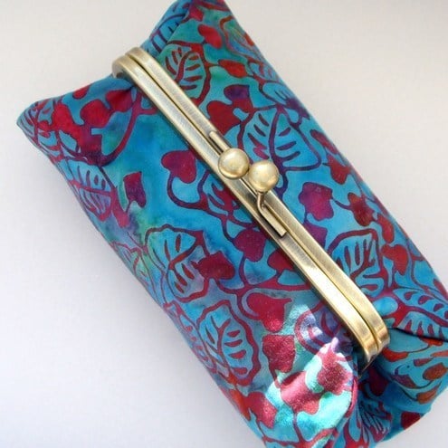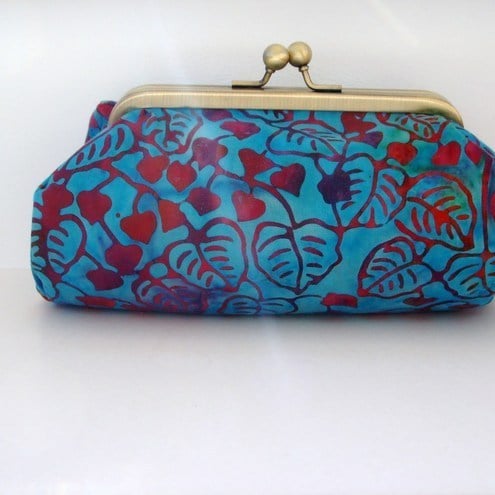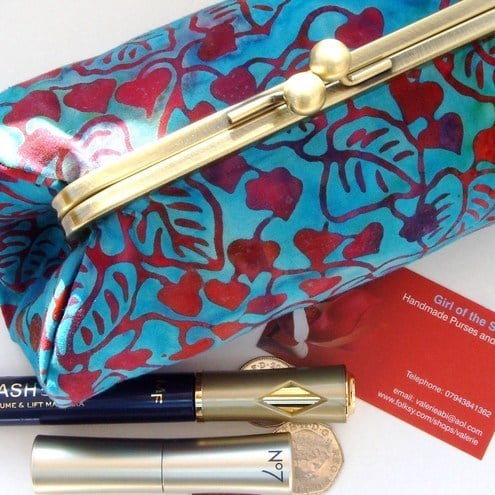 Perfect little clutch for your mobile phone, keys, sunglasses,change and credit cards or even a make-up bag. Pretty fabric with contrasting lining,padding and silver metal frame clasp