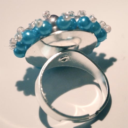This ring is hand made from a selection of dark and light blue/dove pearly beads which are individually strung onto a silver plated ring which is adjustable to fit most ring sizes.