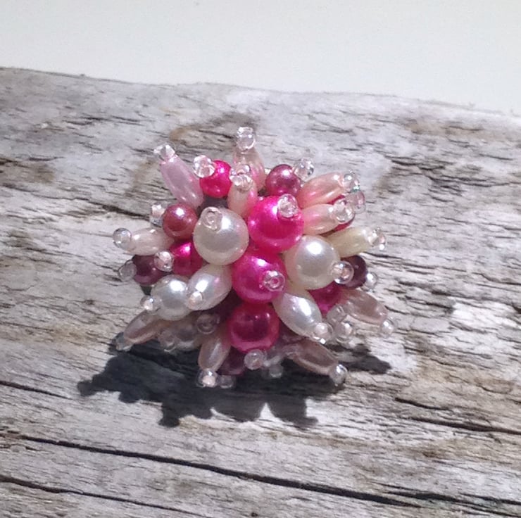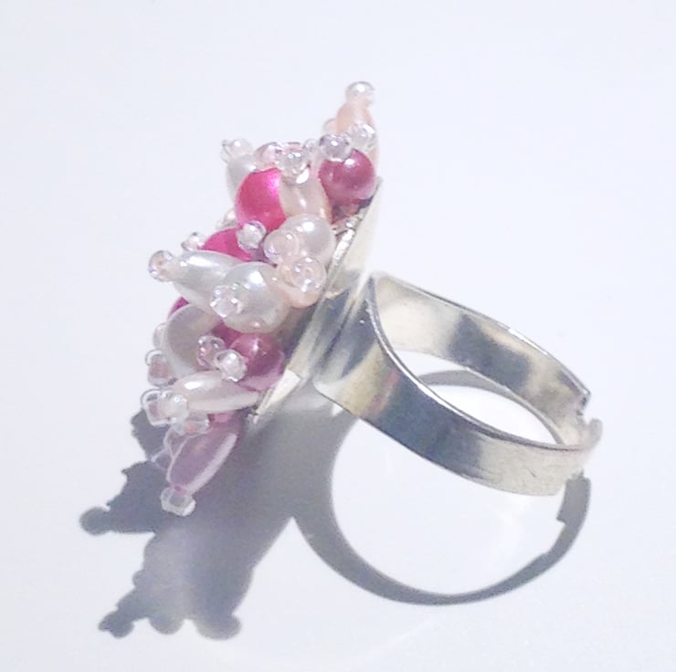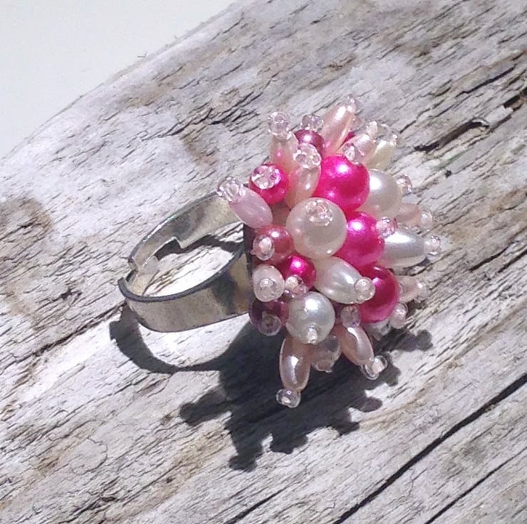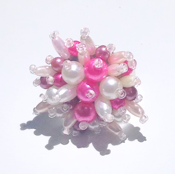 This ring is hand made from a selection of pink and white pearly beads which are individually strung onto a silver plated ring which is adjustable to fit most ring sizes.