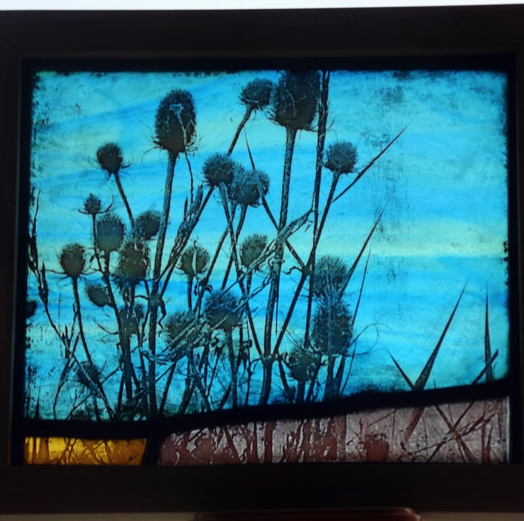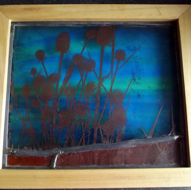 This atmospheric panel is inspired by the Devon seaside and uses my photos of teasels swaying in the breeze at sunset on Branscombe Beach.For this stained glass panel I used blue green, grey and yellow stained glass and the leaded panel is framed in a recycled wooden frame made by a local carpenter from off cuts. The kiln firing process that bonds the image to the glass has given the glass a lovely grainy texture to the glass, which adds to its vintage feel and the photographic detail of teasels is sepia, though it looks black when held against the light.