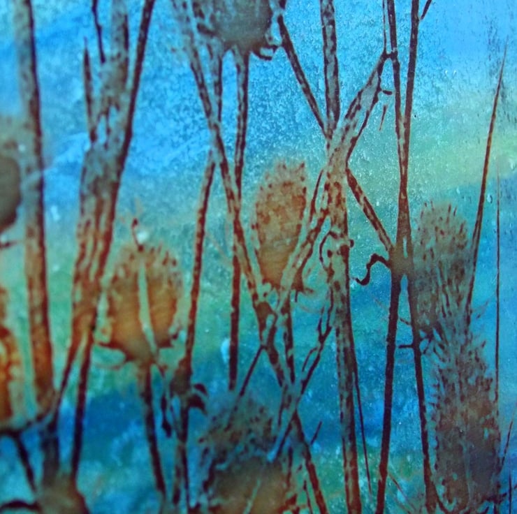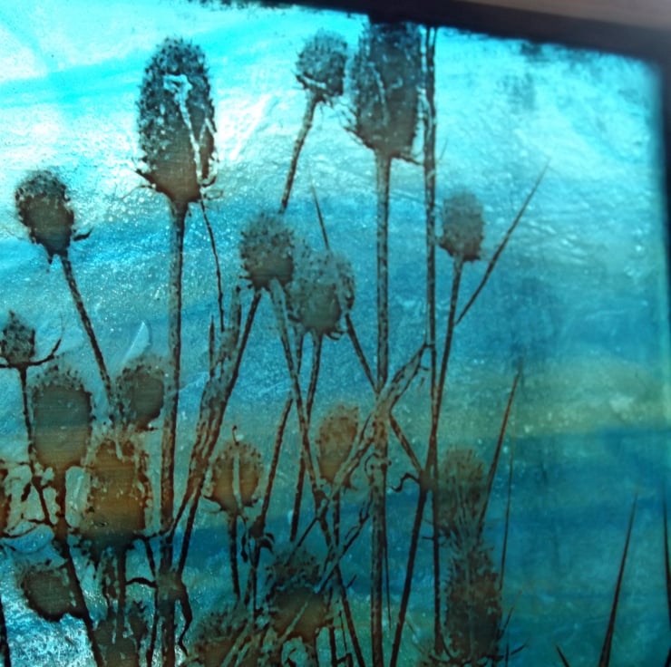 The teasel and grasses detail are of my photos of Branscombe Beach in Devon. I print my photographic image onto special paper and printer from which I make a transfer. This is then carefully placed on the glass and heated to a high temperature in my kiln to bond the image with the glass. I then construct the panel using traditional leading techniques, as with church stained glass windows.