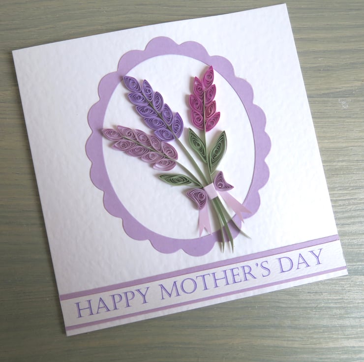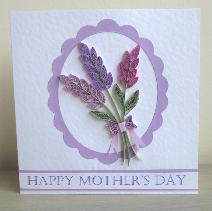 Three sprigs of handquilled lavender in pretty shades of lilac, tied together with a paper bow and mounted in a scalloped oval setting.