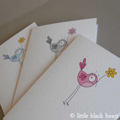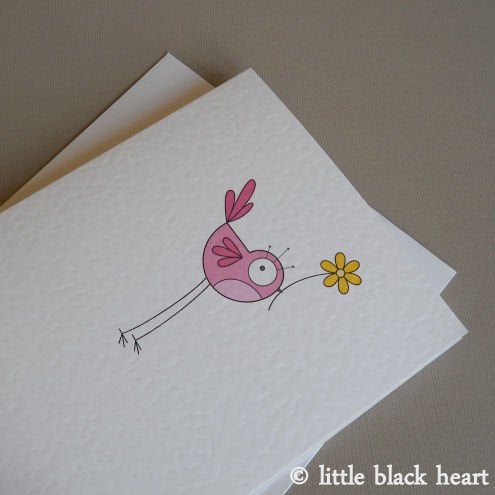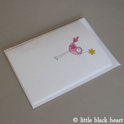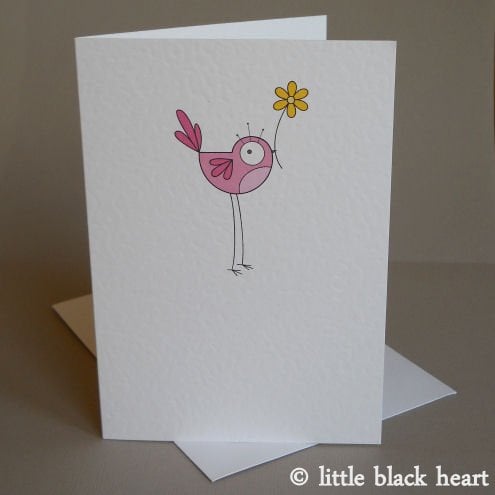 unique and quirky illustrated card featuring a cute pink bird. she is holding a bright yellow flower, just for you! useful for any occasion: a thank you, a birthday, or even just to write someone a little note to say hello.