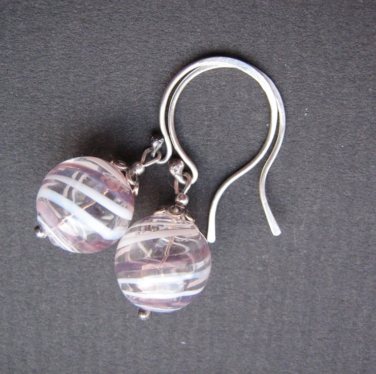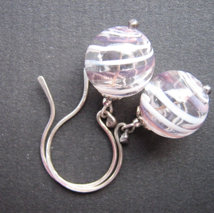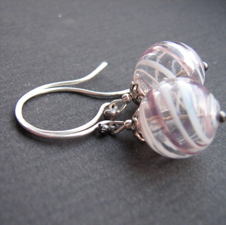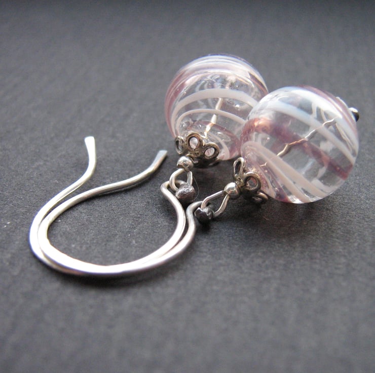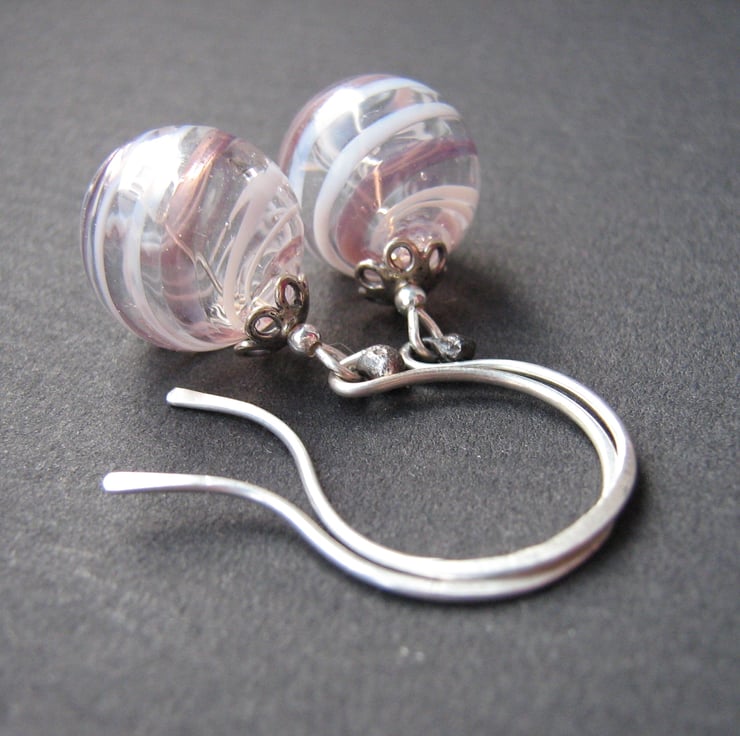 Clear blown glass beads with pink and white swirls couple with handcrafted sterling silver ear wires making these lovely drop earrings. They measure approximately 36mm from the top of the hook. Blown glass is very light due to it's hollow nature, yet strong in structure.