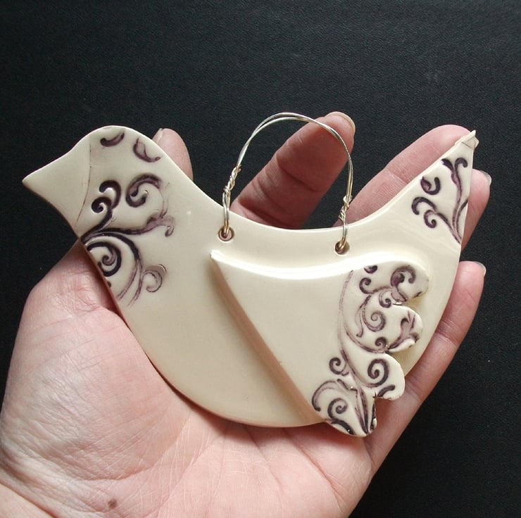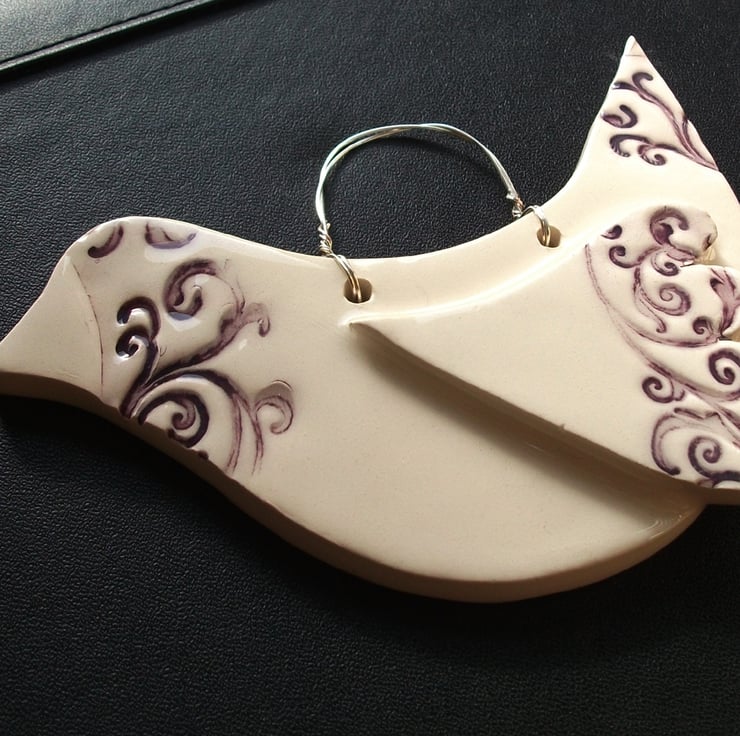 This simply elegant bird decoration is hand cut from white earthenware clay and decorated with an embossed swirl. It is then twoce fried to a top temperature of 1100 degrees so it is nice and strong.