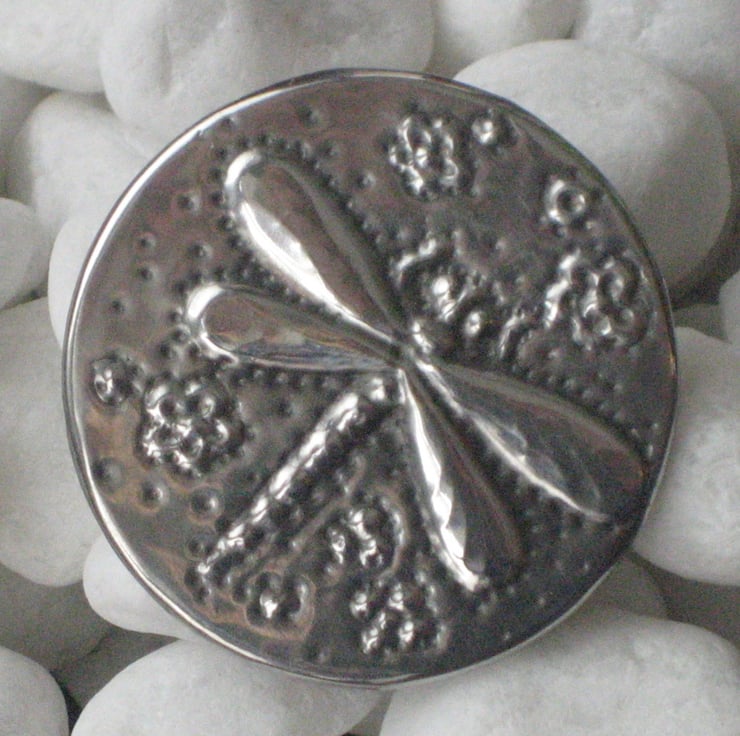 Each pewter piece has been individually made by hand (not cast) to my own design. A pattern is raised on a sheet of pewter, then the raised area is filled. The item is then mounted on a rigid base,chemically patinated, then polished.Modern pewter is lead-free and after patination has a shiny,almost reflective,finish.It does not blacken like silver and can be brightened, if necessary,with a smear of metal polish and a buffing with a soft cloth.