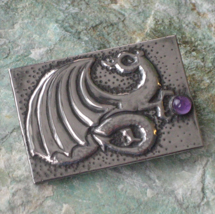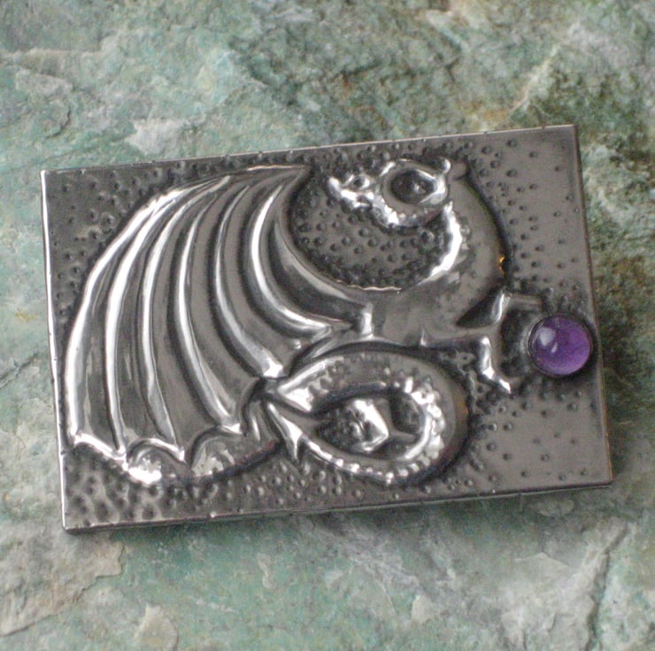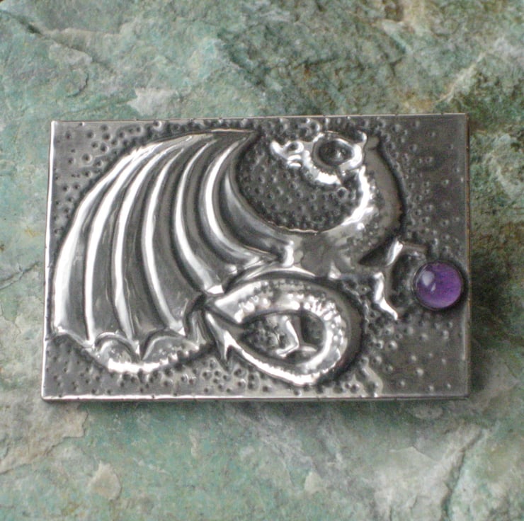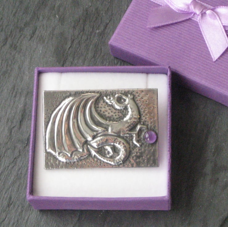 Was £15.50, now £10.00. This unique brooch has been individually hand-made in lead-free pewter, and features a genuine amethyst cabochon. It measures 51 x 35mm and has a 25mm pin with safety catch. Gift boxed.
