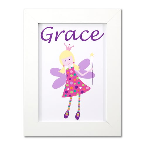 This pretty fairy picture is an original, personalised framed print designed to go on a girl's bedroom door. They look equally great in any other part of their bedroom or playroom too though!