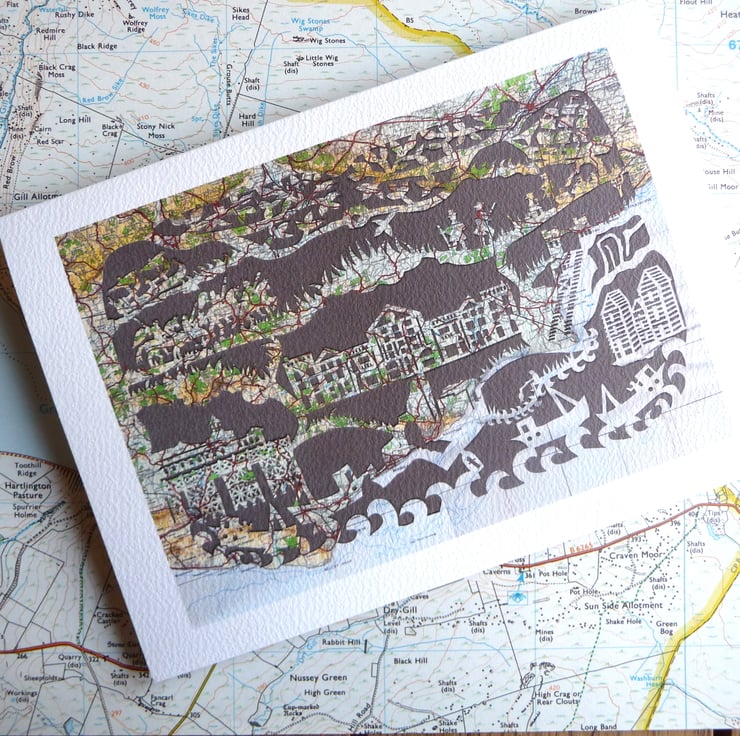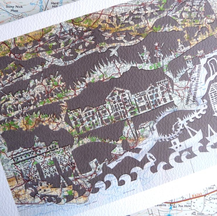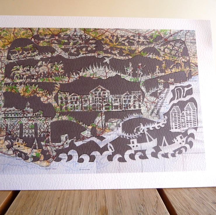 This is a paper cut I made on an old Quarter-inch ordnance survey map of South East England. It features Hastings as a town and its history.