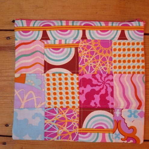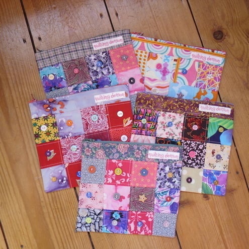 I have designed this large zipped purse with patchwork squares, embellished with decorative buttons on the front. It is quilted to accentuate the square patchwork pattern.The purse is quite large, measuring 7.25"h x 8"w, so could be used as a make-up purse, pencil case or a travelling sewing supply case.