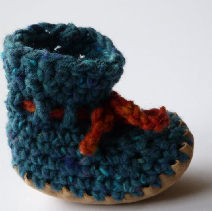 These funky little shoes will keep your baby's feet snug and warm. Soft chunky wool and angora fabric with stretch for comfort and growing room. A perfect gift for a baby boy or girl.
