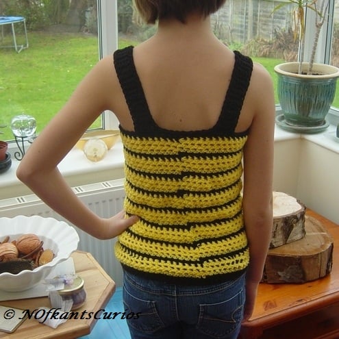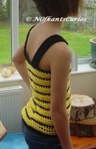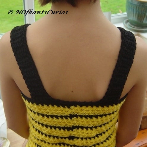 Bumble Bee Top is a simple wide strap, camisole style top, crocheted in the contrasting yarns with two differing crochet styles, giving a ruched effect and finished with a little crocheted floral embelishment, that has a central black and gold button, sewn securely to the front of the base of the left shoulder strap.