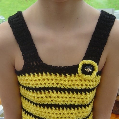 Bumble Bee Top, is a Hand Crocheted Girl's Strappy Top, in 100% Black and Yellow acrylic yarn, which is wonderfully baby soft.