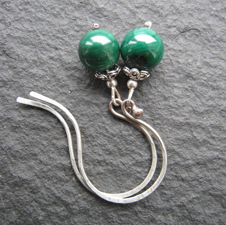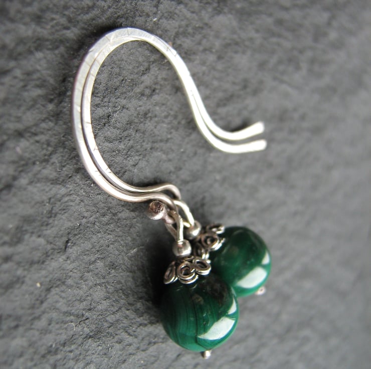 Stunning deep green beads of Malachite hang from handcrafter sterling silver ear hooks which have been heated and shaped before polishing back to a shine. All metal parts are sterling silver, and overall drop length is approximately 38mm.