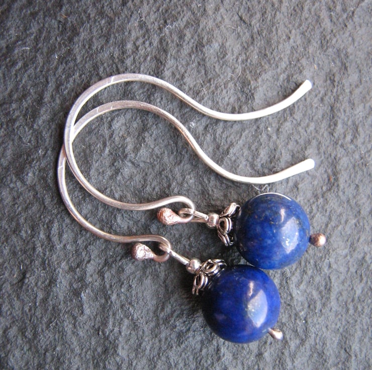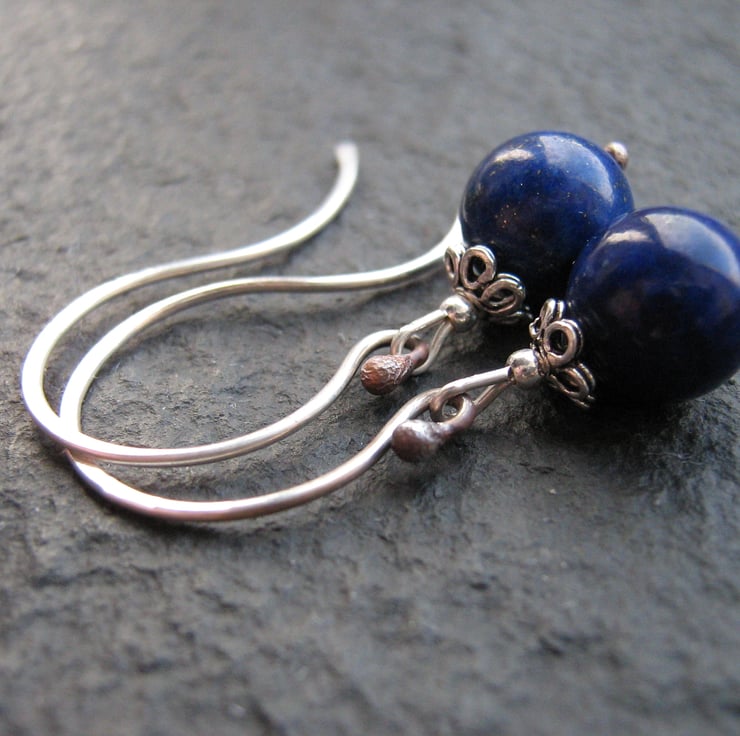 These gorgeous midnight blue beads of lapis lazuli measure 8mm across and hang from handcrafted sterilng silver ear hooks which have been fired to create the decorative ball ends. All metal parts are of sterling silver. The overall drop length is approximately 34mm.