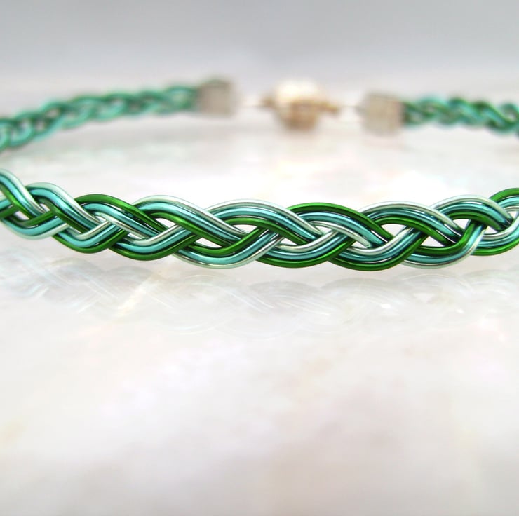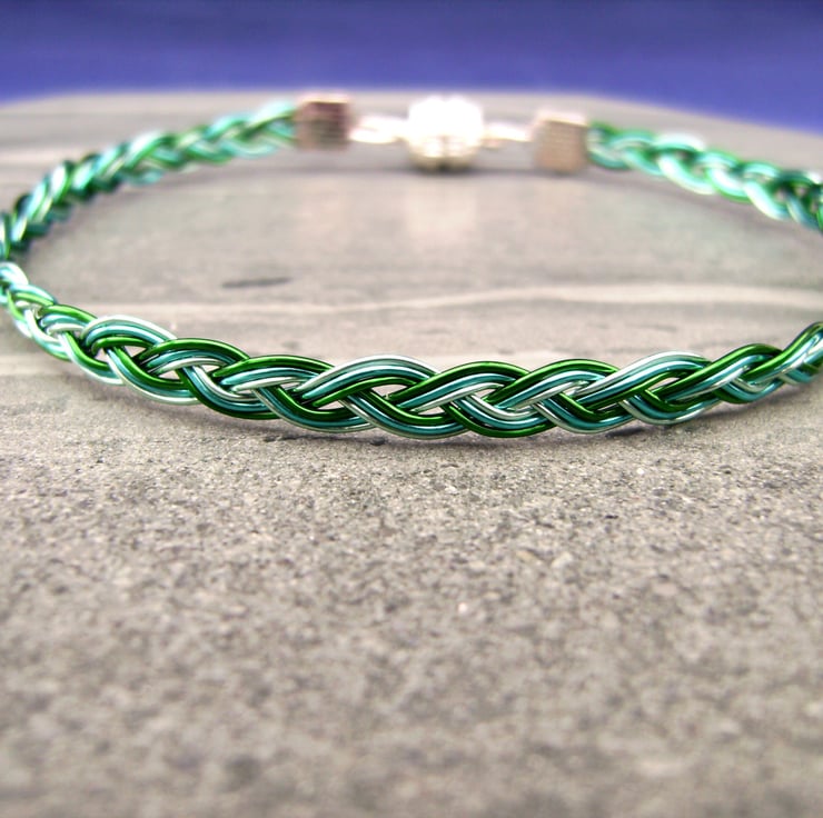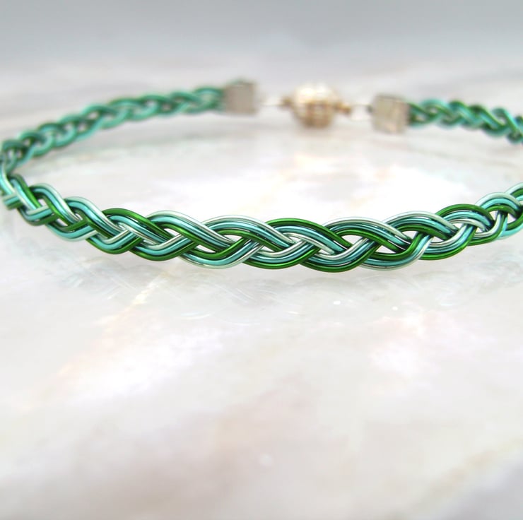 This bracelet is made with 9 pieces of coated copper wire braided by hand and completed with a silver plated magnetic clasp. It is approximately 9 inches, but size can be customized, Please ask prior to purchase. It will be sent in a gift box.