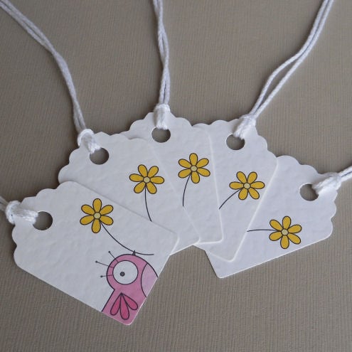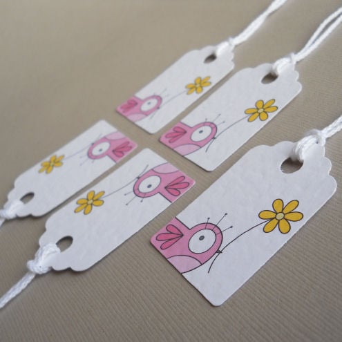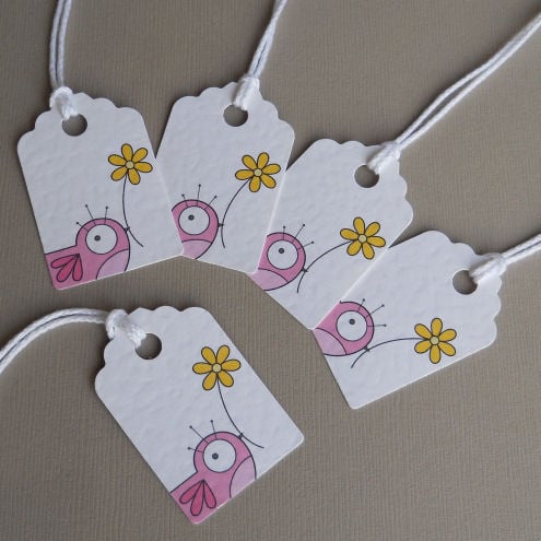 a pack of 5 tags, featuring a little pink bird holding a bright yellow flower. cute and quirky, and great to use for decorating, labelling or as gift tags.