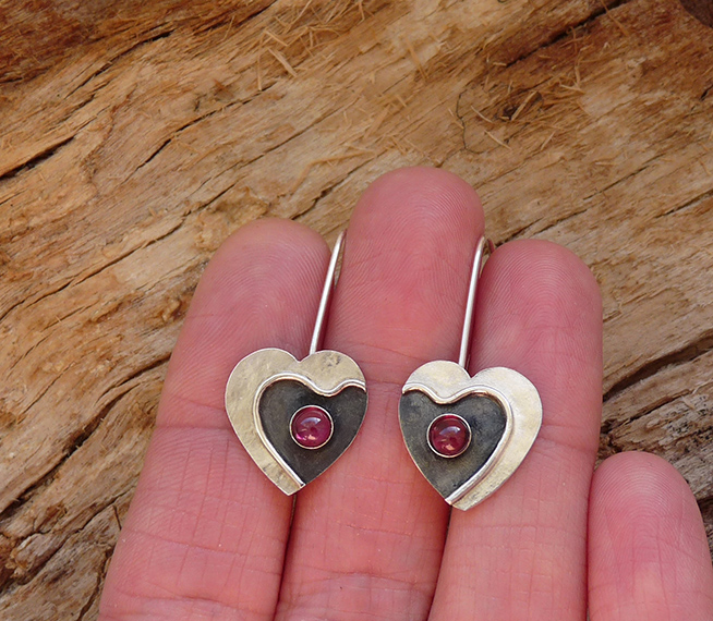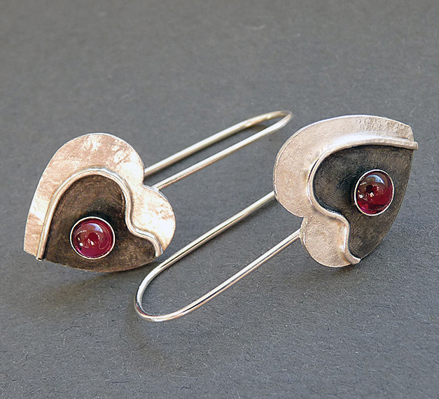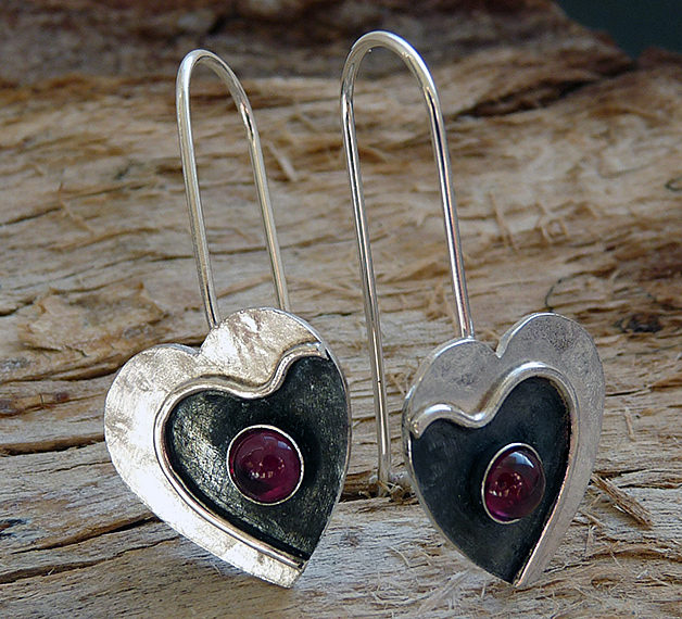 These contemporary heart earrings with Garnet are completely hand made in sterling silver. They have been textured, partially oxidized and polished to a bright and shiny finish. They have sterling silver ear wires soldered to them.