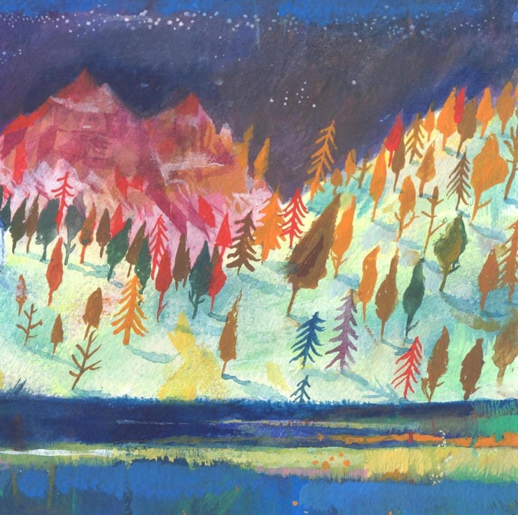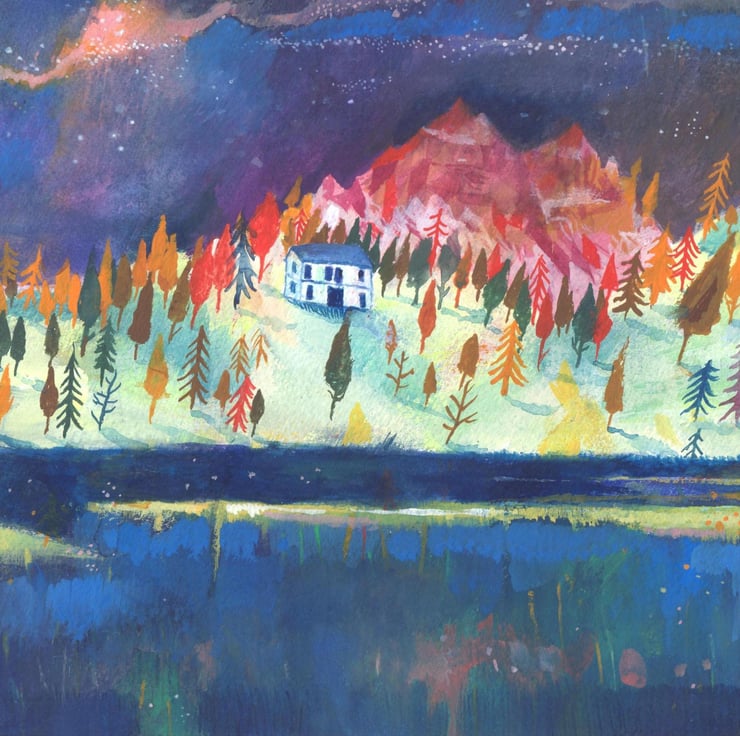 This A4 print of the original painting interpretes themes in naive art from the turn of the last century. It is painted in a subtly complementary palette, to enhance the happiness of your home.