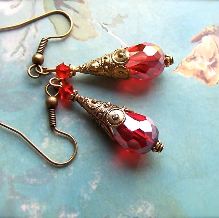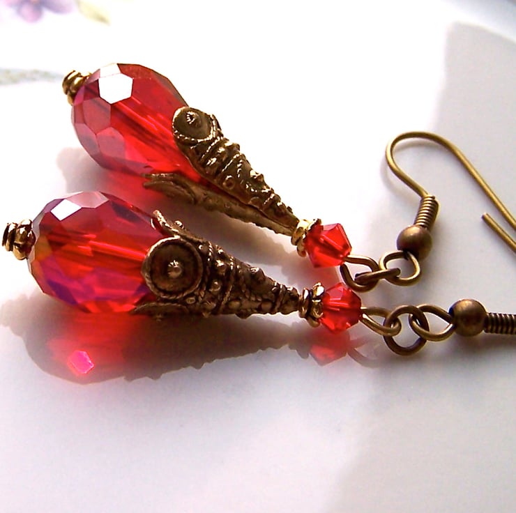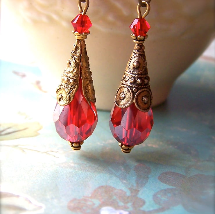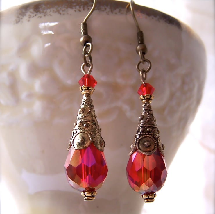 These gorgeous earrings feature beautiful crystal teardrop beads in a rich shade of red, accentuated by fancy Tibetan-style antique gold finish bead cones and tiny sparkling swarovski crystals.