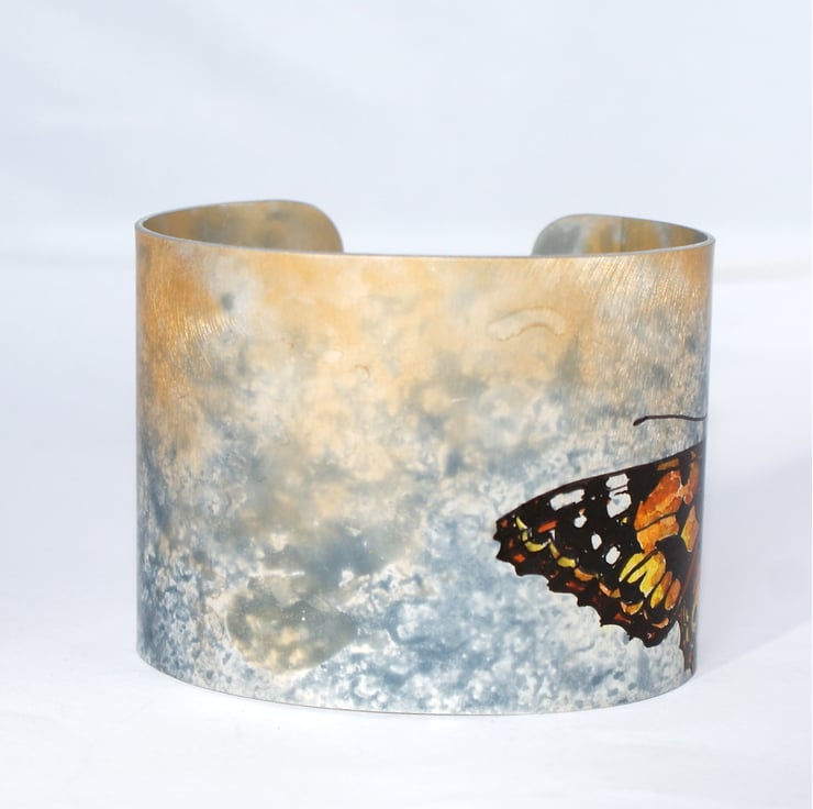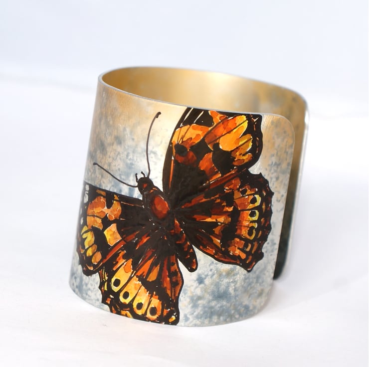 Made to order. A hand illustrated and painted aluminium cuff with a gorgeous butterfly on one side. The butterfly is a 'Painted Lady'. The cuff is also hand dyed in greys and bronze. Please note this cuff is made to order so may vary slightly from the image shown.