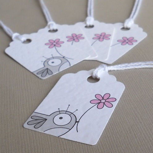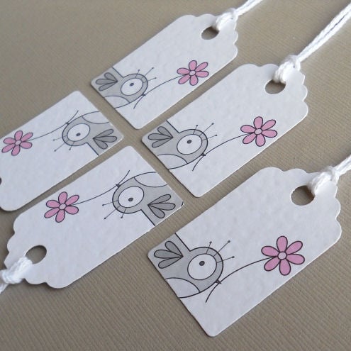 a pack of 5 tags, featuring a little grey bird holding a lovely pink flower. cute and quirky, and great to use for decorating, labelling or as gift tags.