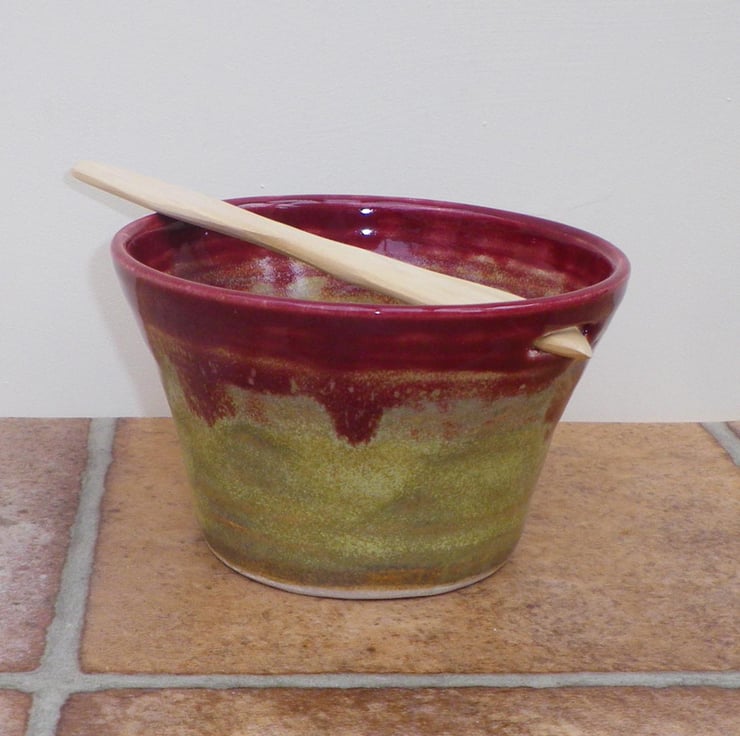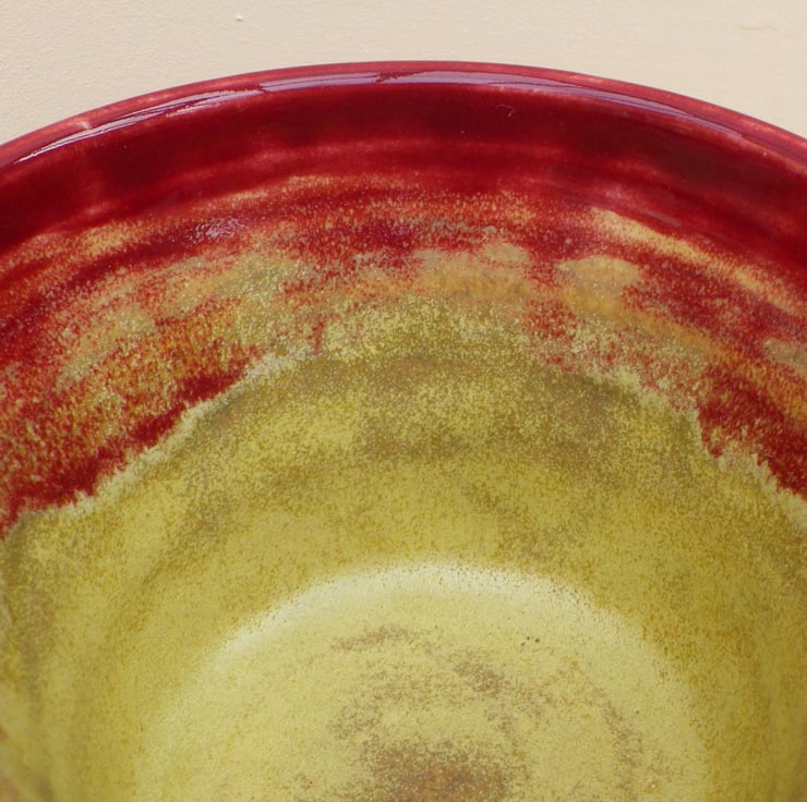 This bowl was thrown on my pottery wheel using strong stoneware clay and finished in oatmeal reactive glaze with a lovely crimson red drizzled over the rim.