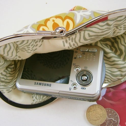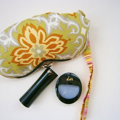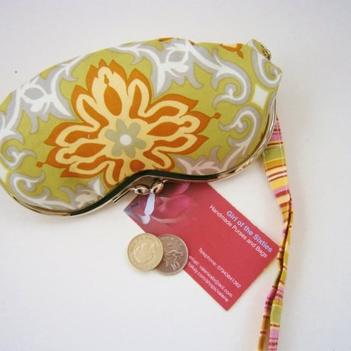 Charming little wristlet purse for sunglasses or mobile phone in pretty Amy Butler fabric with contrasting lining and removable wrist strap. Measures approx 7x3.5