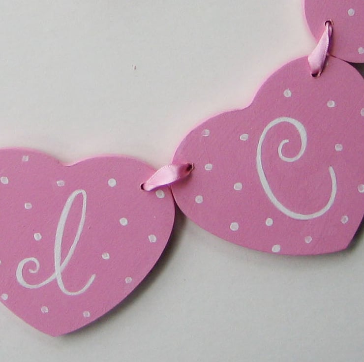 They are pink with hand-painted decorative initials in white. This garland is for a 5 letter name. Extra hearts, to make a longer name, can be ordered at £2.50 each. They make adorable Christening or birth presents, and look very pretty hanging on a cot or door.