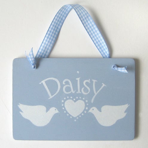 A decorative, personalised wooden plaque for a girl or boy's room, depicting a pair of doves and a heart. There is a choice of carnation pink or pale dusty blue. They have a matching gingham ribbon.
