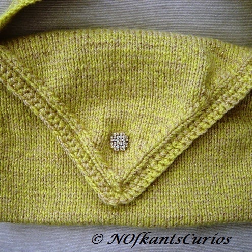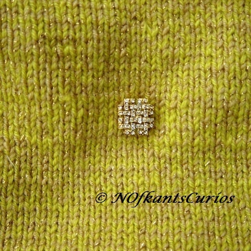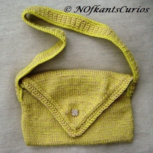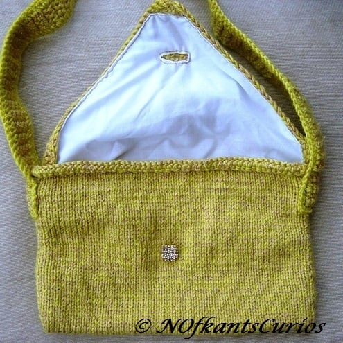 Spring Gold Hand Knitted, Crocheted and fully lined handbag, with an envelope flap over front & sparkling Goldtone button detail.