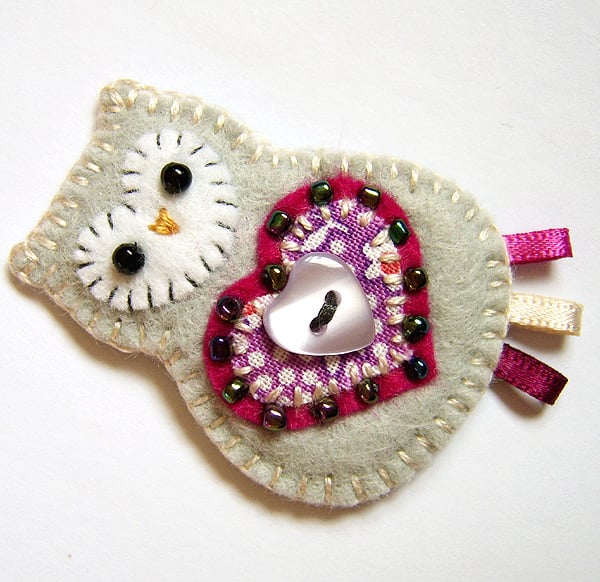 This is a little owl brooch in grey felt, complete with a pretty heart motif with beading detail and a central little pink heart button. It is finished with cream blanket stitch edging and ribbon details in coordinating colours. There is brooch pin backing on the reverse side for easy attachment.