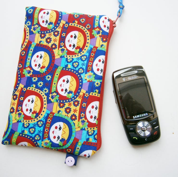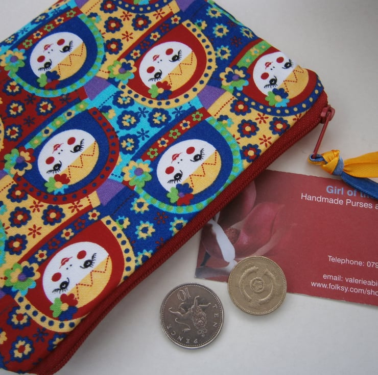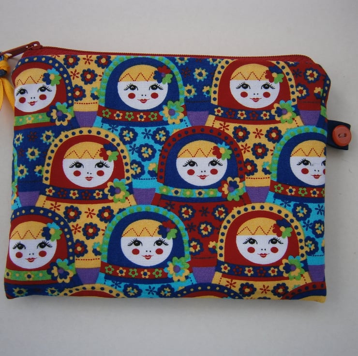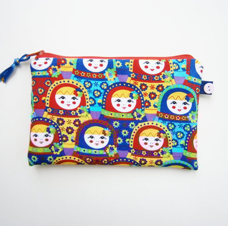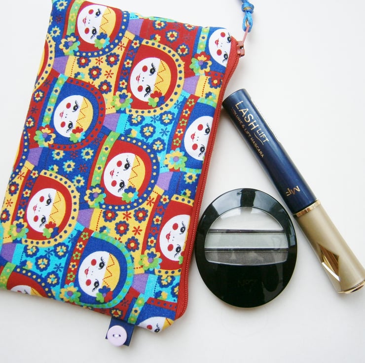 Cute Russian doll make up bag / pencil case with contrasting zipper and ribbon and contrasting lining
