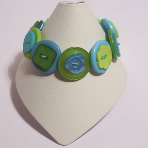 This distinctive button bracelet is rich with an assortment of lime and aqua buttons.