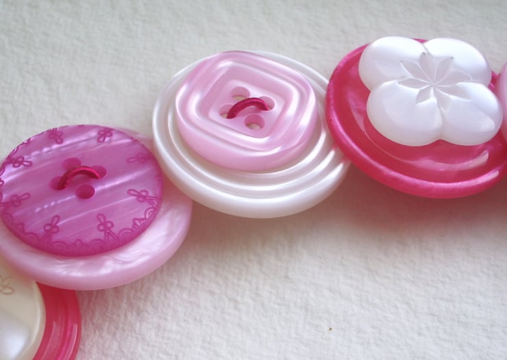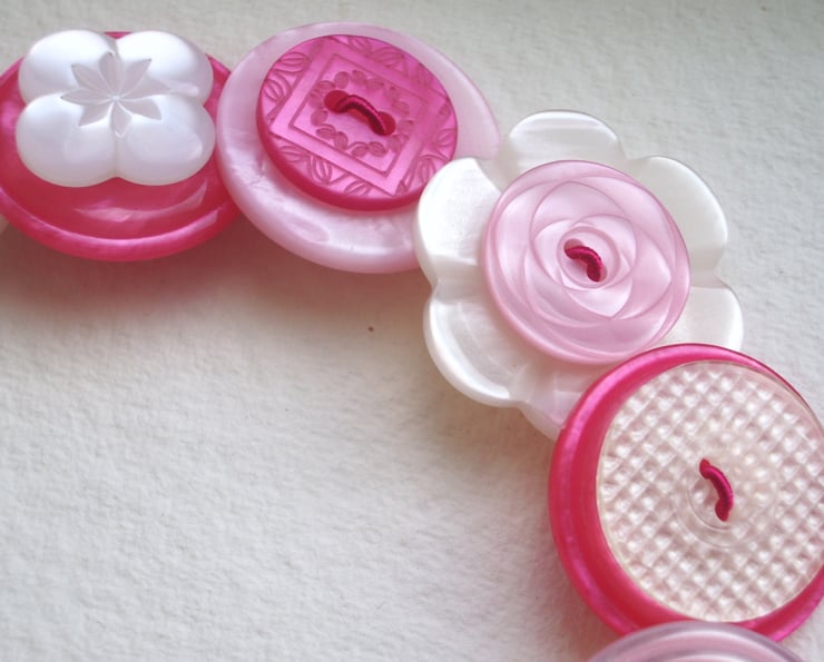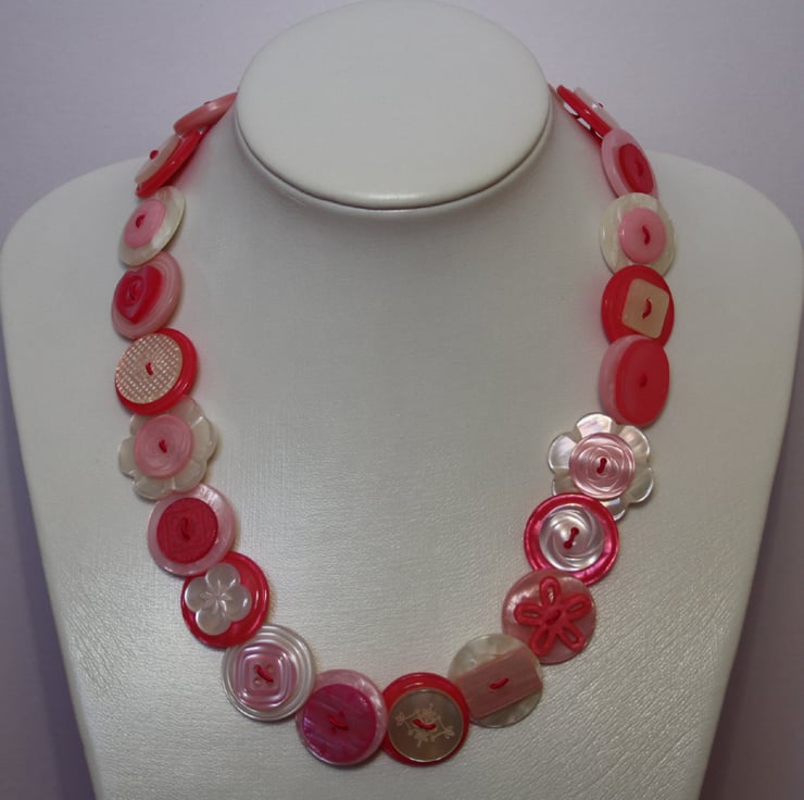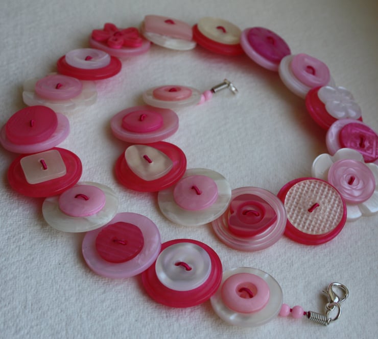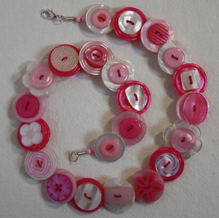 This distinctive button necklace is rich with an assortment of hot pink, pale pink and pearlescent buttons. These are threaded onto jewellery wire, which secures at the end with a silver plated lobster clasp fastener.
