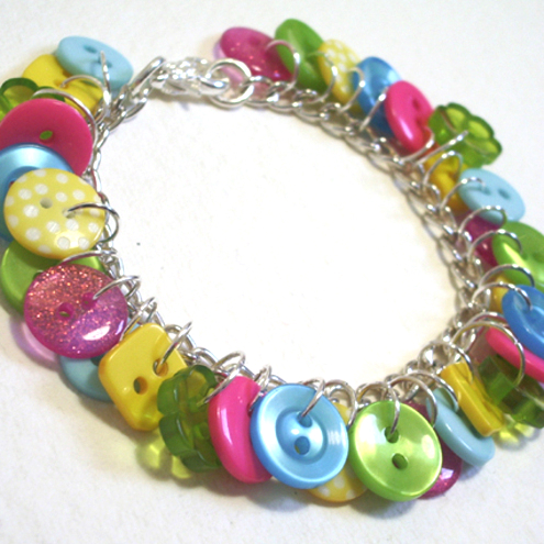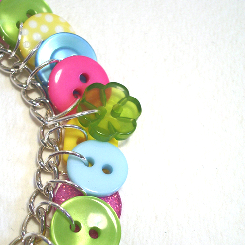This distinctive button bracelet is rich with an assortment of lime green, hot pink, yellow and aqua coloured buttons.