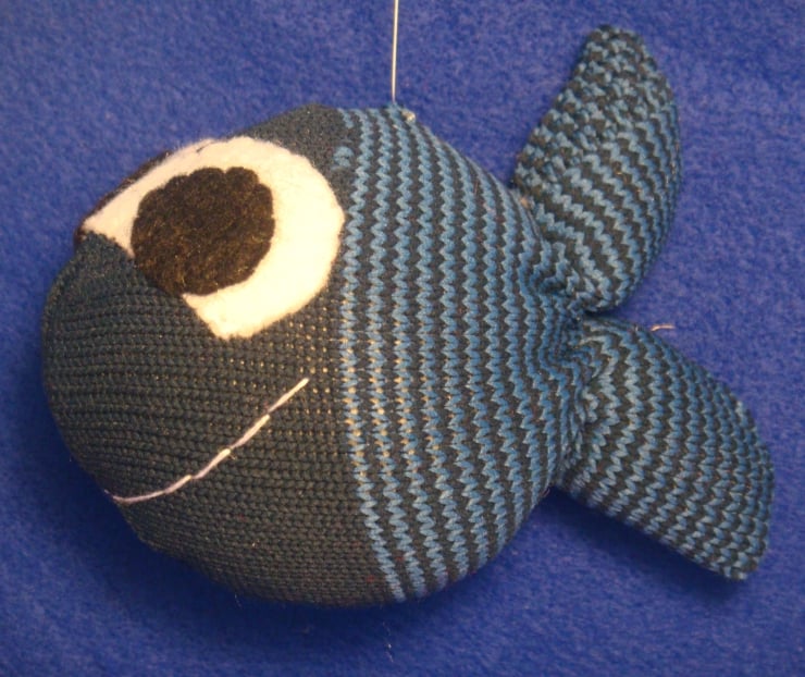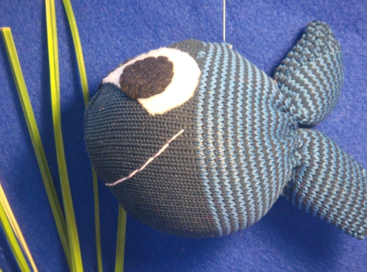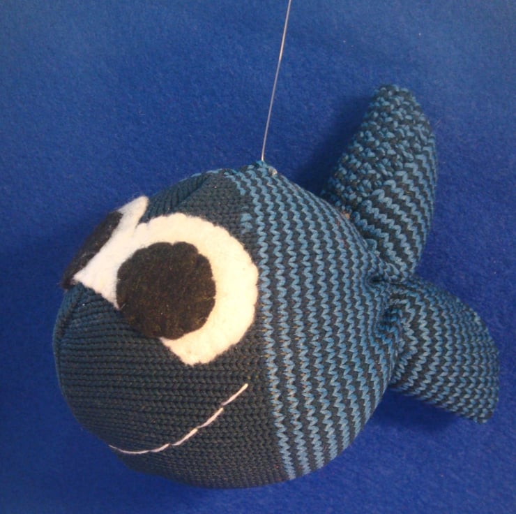 This blue fish is made from a striped polyester sock, handsewn and filled with hollowfibre filling (which complies with the furniture and furnishings (fire safety) regulations 1988). The eyes are made of felt and attached by handstitch.