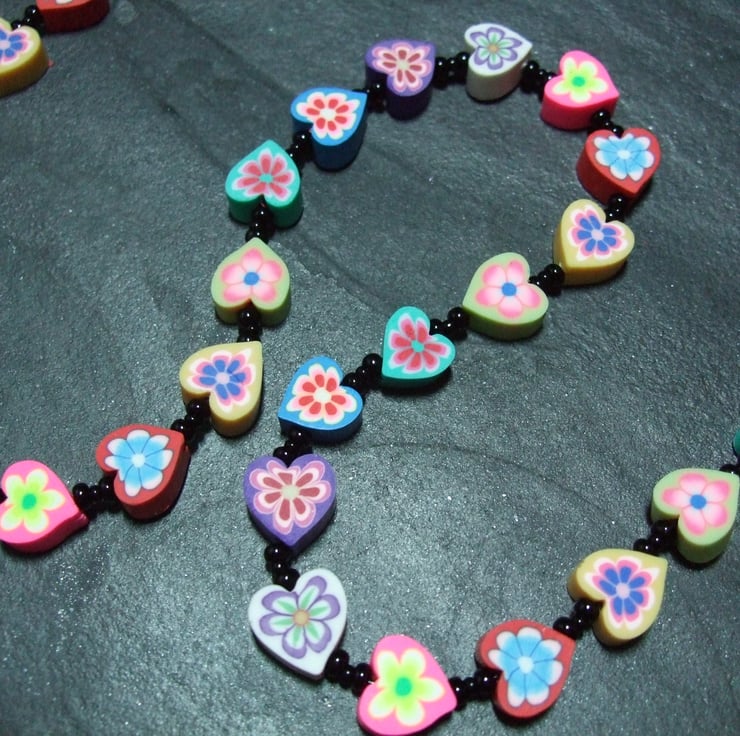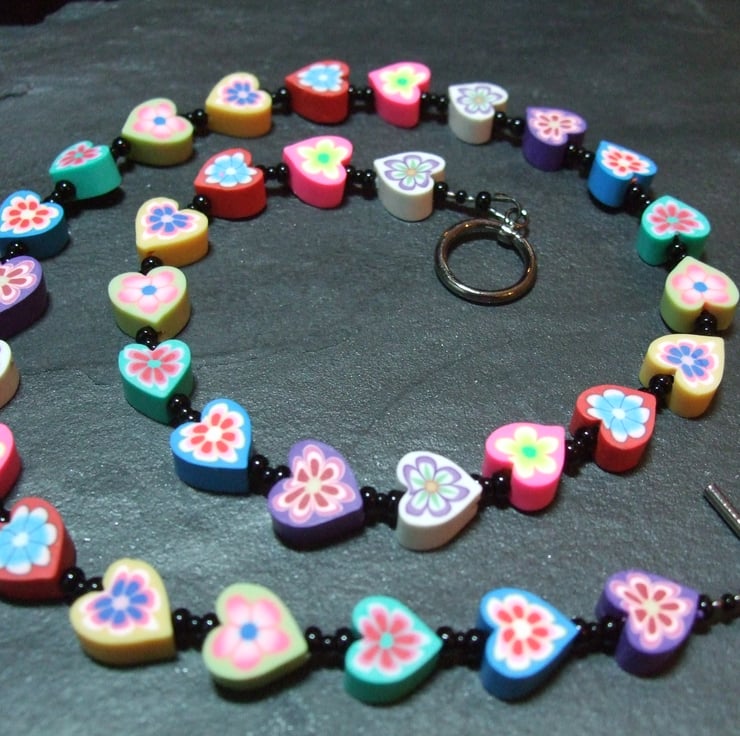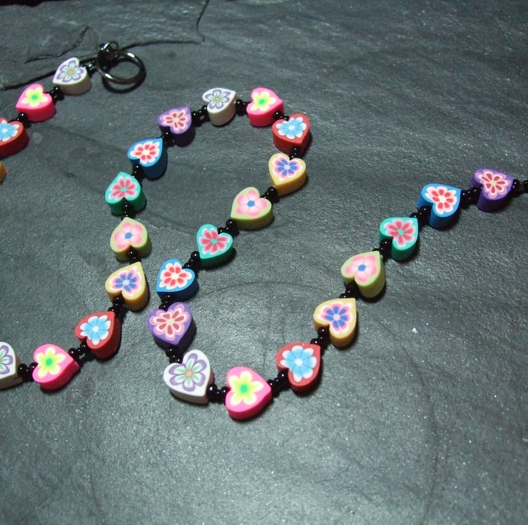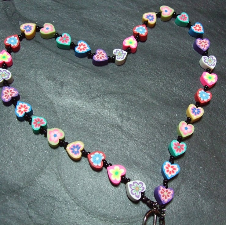 A cute, whimsical necklace from the Kitsch Creations New Love Heart Collection, this item is lovingly constructed using miniature heart-shaped polymer clay canes off-set to dramatic effect with the simplest black seed beads and high quality black metal jewellery findings.