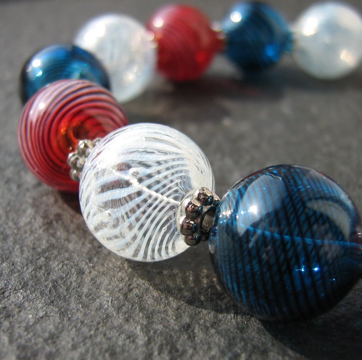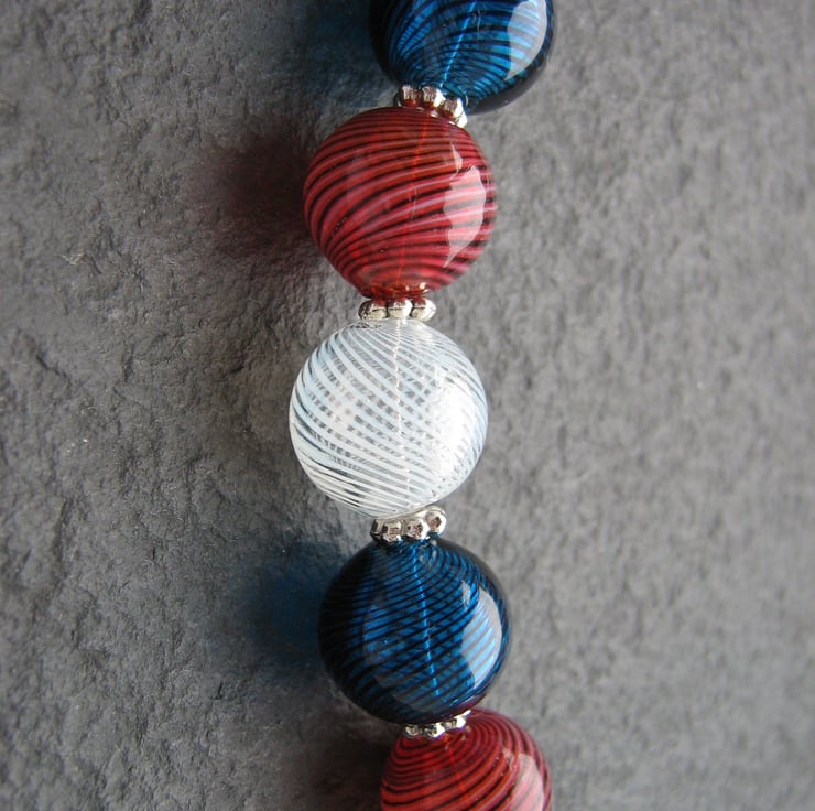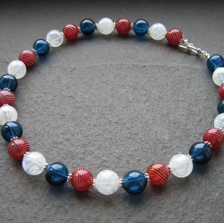 This necklace features blown glass beads of red, white and blue making a real statement piece that can be worn long after the celebrations are over. The finished necklace measures approximately 17.5" and comes gift boxed.