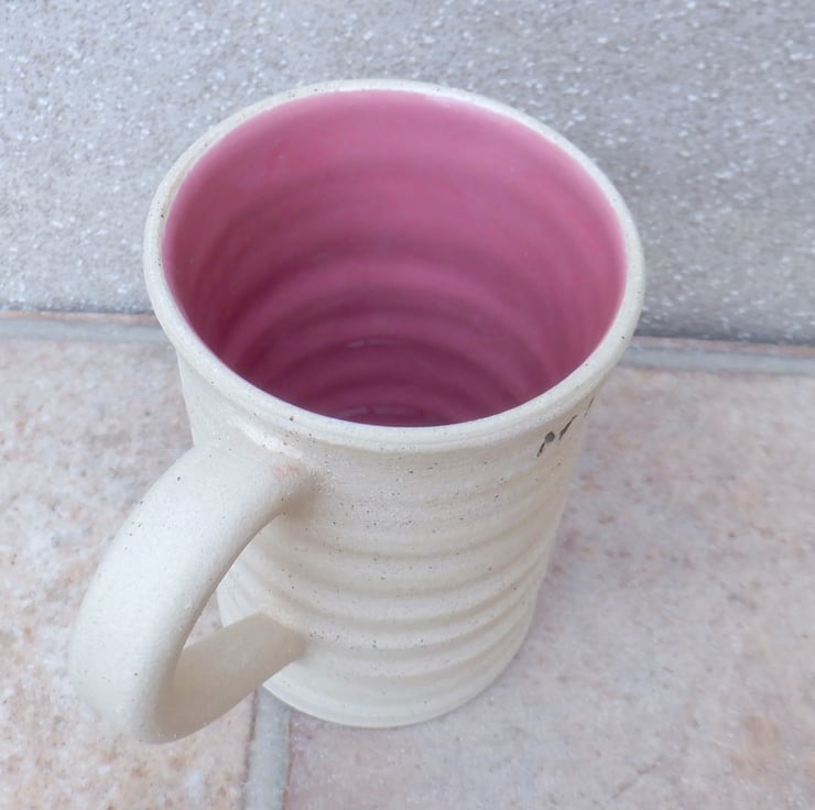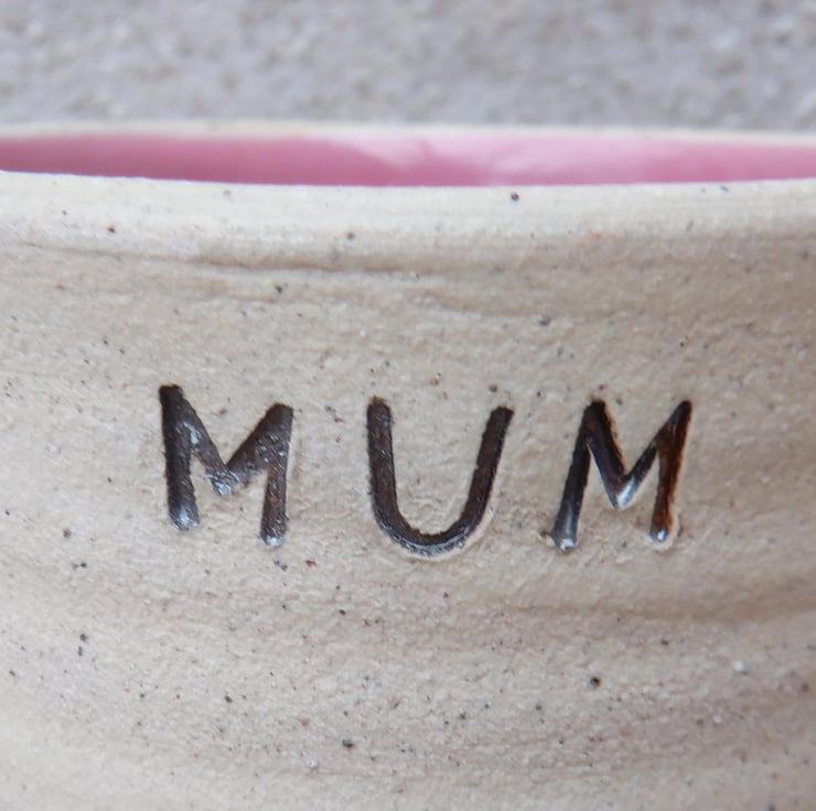I threw this mug on my pottery wheel using strong ivory speckled stoneware clay, stamped MUM in the side, highlighted in bronze, and finished it in a pretty rose pink glaze.