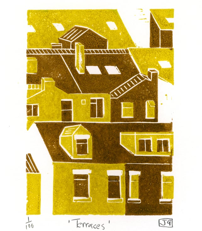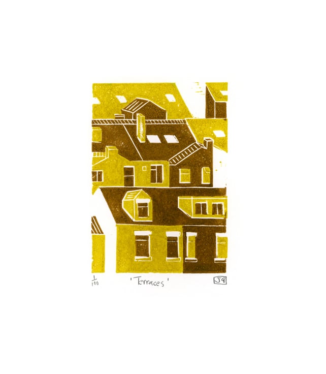 A 2-colour hand-printed linocut print entitled 'Terraces'.
