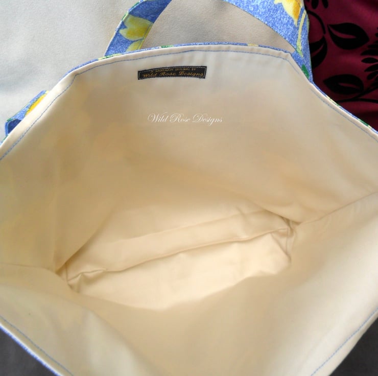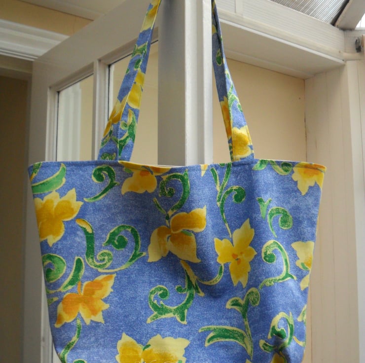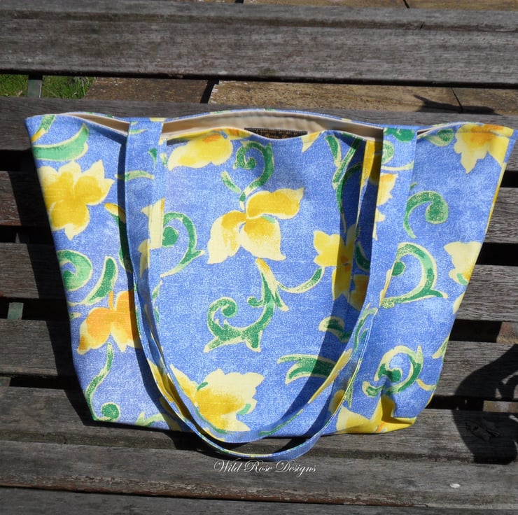 This sturdy shopper is made in a bright and summery blue cotton print and is fully lined and interlined. The straps are long enough to fit comfortably over your shoulder.